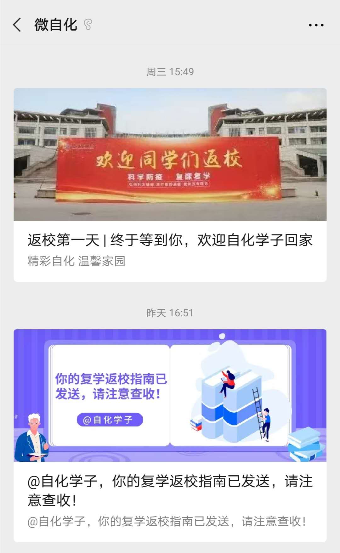 面向全体自化学子,在“微自化”官微推送《复学返校指南》,简洁、清晰地明确了返校每一环节学生需完成的事项,为学生安全、有序回归校园奠定了基础。同时,北京赛车PK10