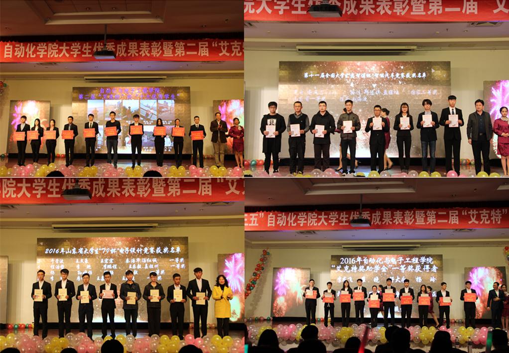 2016年自主实习实践先进个人的决定》,揭晓了各类奖项的获奖学生名单。校党委常委、副校长韦殿华为第二届“艾克特”杯十大优秀学生称号获得者颁奖。校团委书记王锋业、学生处副处长秦姣分别为第十一届全国大学生“恩智浦杯”智能汽车竞赛获奖团队和2016年山东省大学生“TI杯”电子设计竞赛获奖团队颁奖。校友企业家代表宋明忻、王凡和王潘三位颁奖嘉宾分别为 “艾克特”奖助学金获得者颁奖,赵嵘为2016年全国大学生“西门子杯”工业自动化挑战赛获奖团队颁奖。