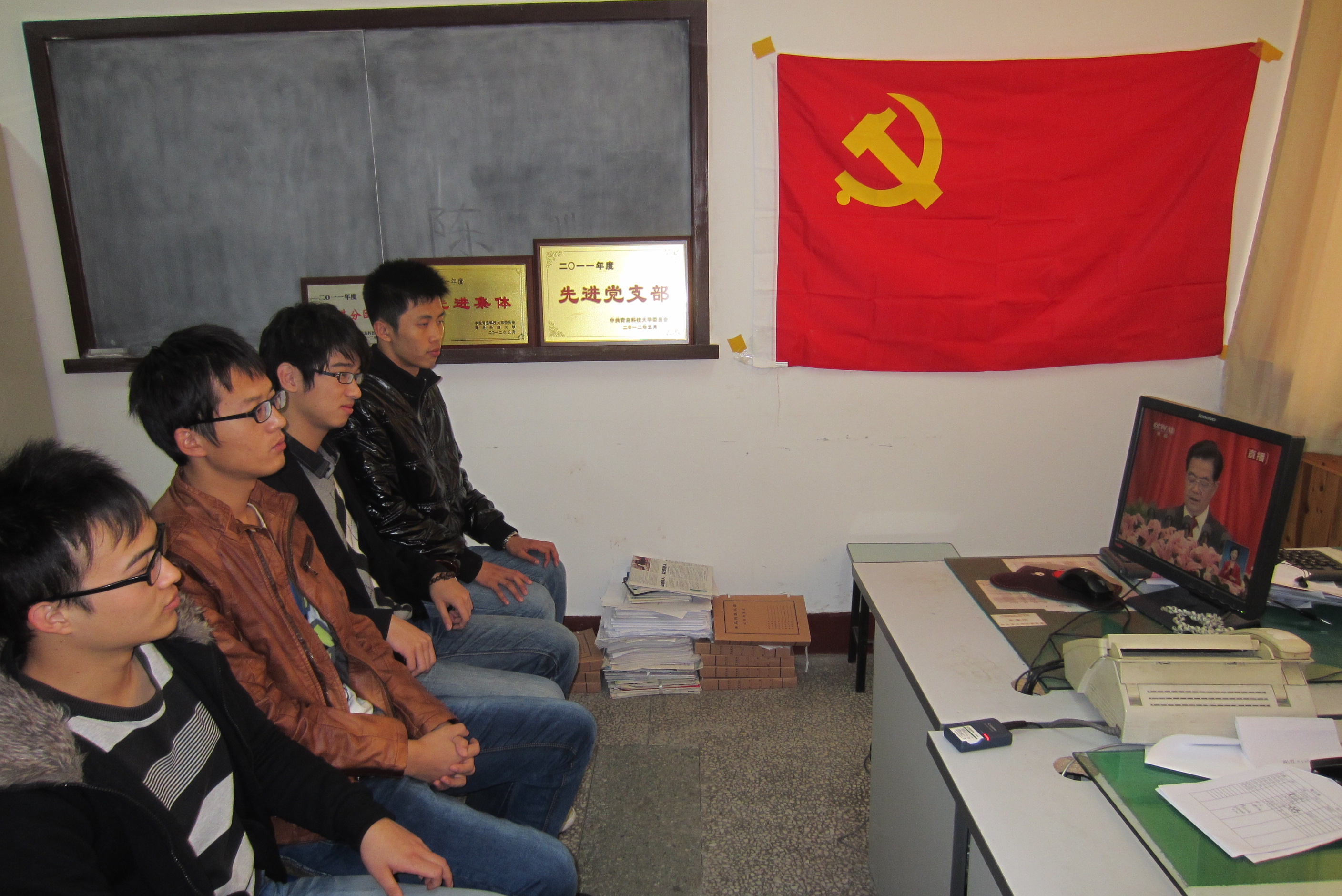 分团委发挥学生会、研究生会等学生群团组织的载体和纽带作用,在不影响上课的情况下,精心组织学生党员、入党积极分子、学生干部以及广大青年学生在宿舍、在会议室、实验室收听收看中央电视台、中央人民广播电台、人民日报、人民网等主流媒体关于十八大开幕的实况转播。