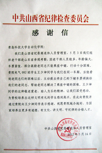 电气082班学生王少坤同学与他们在同一车厢。当他看到老同志们的困难以后,主动提出将自己的下铺车票调换给我们的老同志,帮助老同志解决了乘坐中铺的困难。王少坤同学的这种敬老爱老、助人为乐的精神,让我们深受感动,为贵校培养出这样文明有礼的学生感到高兴。在此向贵院并通过贵院向王少坤同学表示感谢,祝愿贵院越办越好,为国家培养出更多有道德、有文化、讲文明、守纪律的合格人才。