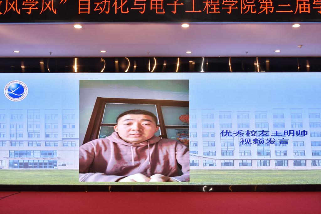 “佳运助学金”创始人、优秀校友王明帅学长作视频发言,倡导全体同学增强体质素质,增加自身见闻,保持饱满昂扬的精神状态。
