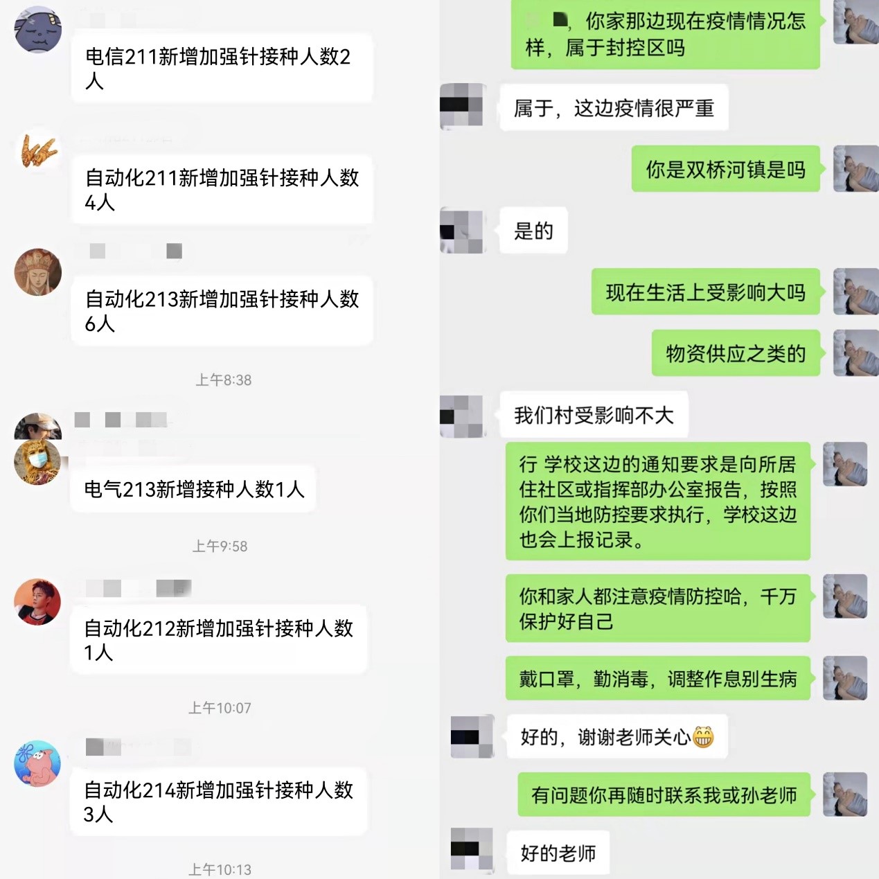 疫情防控要求,督促学生每日健康打卡,关注返乡学生尤其是中高风险地区学生健康状况,建立班级疫苗接种台账并实行周更新制,引导学生应种尽种加强针,做好居家防控;加强人文关怀,落实资助育人,开展2022年寒假“暖冬”线上走访活动,了解家庭经济困难学生情况,宣讲资助政策,深化“扶贫”与“扶智”有机结合,实现“AI平安”学生工作增温提效。