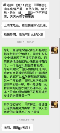 防控举措及学生近况,提供缓解疫情期间焦虑情绪的方法,引导学生自觉遵守疫情防控有关规定,疏解压力,通过参与文体活动、志愿服务等方式丰富课余生活,让家长迅速知情、放心安心。不少家长通过视频、微信聊天、电话沟通等方式表示对北京赛车PK10