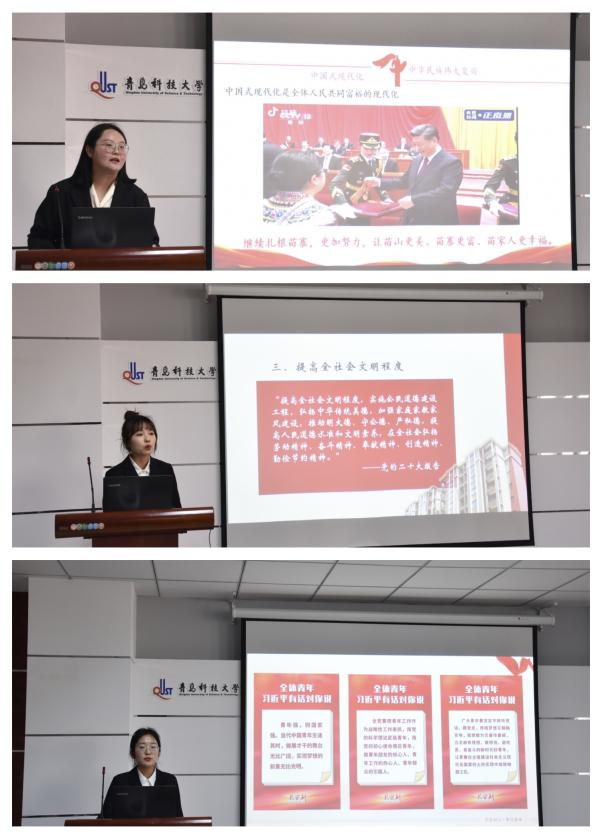 师生代表总结发言。马仁轩表示,党员同志、学生干部要牢记习近平总书记的嘱托,自信自强,守正创新,踔厉奋发,勇毅前行,更加积极地以实际行动践行“请党放心,强国有我”的青春誓言。边泳名表示,此次宣讲带领大家从专业角度深入学习了党的二十大精神。作为一名青年党员、学生干部,她结合自身成长发展经历,号召更多青年坚定理想信念,厚植爱国情怀,练就过硬本领,强化使命担当,让青春在全面建设社会主义现代化国家的火热实践中绽放绚丽之花。