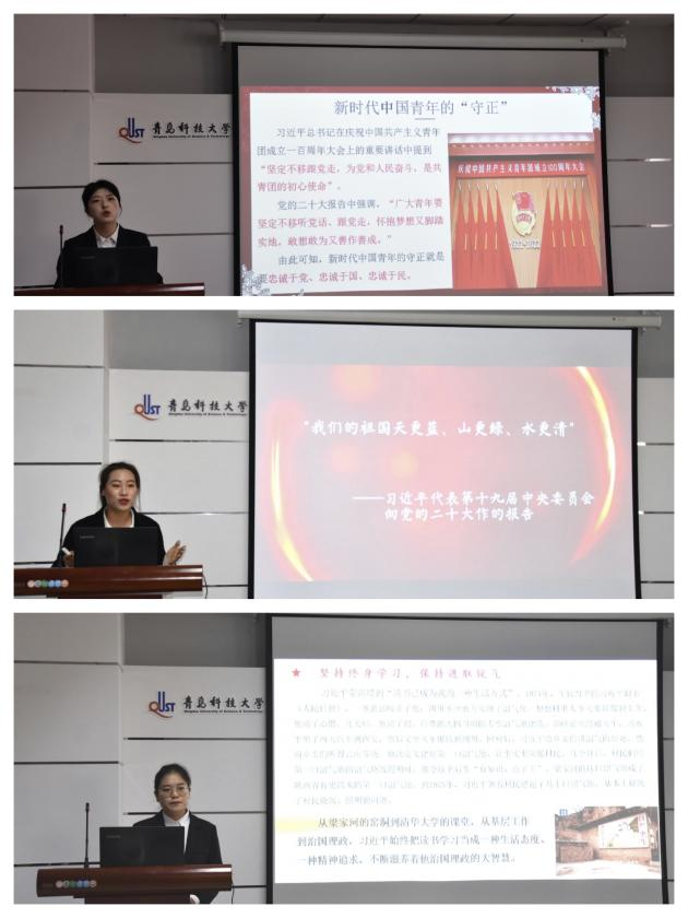 庞靖、李婷婷、吕靓、王云敏、申文理、于洋六位宣讲团成员分别围绕不同主题展开宣讲。庞靖、李婷婷把握“学雷锋志愿服务月”这一重要时刻,以“传承雷锋精神,弘扬时代新风”为重点展开宣讲,结合“中华民族伟大复兴”、“贯彻落实新思想”等方面,引导青年学子“坚定理想信念,牢记为人民服务”、“坚持终身学习,保持进取锐气”、“坚持实事求是,勇于开拓创新”,生动诠释了党的二十大精神和新时代雷锋精神的践行与落实;吕靓、王云敏结合中国青年的时代特点,突出中国青年的“守正”与“创新”,探讨了青年担当时代使命的必要性以及应如何担当时代使命;申文理围绕“为何要推进文化自信”和“怎样推进文化自信”两个方面展开具体讲解;于洋则以“守好绿水青山坚持人与自然和谐共生”为题,结合党的二十大报告重点内容解读,呼吁广大新时代青年以实际行动贯彻可持续发展理念,为建设美丽中国贡献力量。