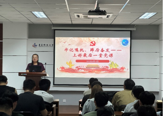 楼410会议室开展“最后一堂党课”,学生第一党支部书记郭蒙蒙老师结合学生们大学四年学习生活的经历,对即将踏上新的学习和工作岗位的同学们提出了殷切的期盼和嘱托,希望同学们能够勇于担当党员责任,时刻不忘党员身份,不断提高党性修养,以昂扬姿态踏上新征程,以奋进青春建功新时代,让青春在全面建设社会主义现代化国家的火热实践中绽放绚丽之花。