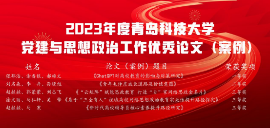 在2023年度党建与思想政治工作优秀论文(案例)评选中,张郁浩、谢香银、郝雄文撰写的《ChatGPT对高校教育的影响与对策研究》荣获一等奖,刘名森、李卉、孙晓旭撰写的《青年毛泽东成长道路及价值意蕴》荣获二等奖,赵赪赪、郭蒙蒙、刘志飞撰写的《“云矩阵”赋能思政教育 打造“自”家网络思政金名片》,赵赪赪、马寒撰写的《基于“三全育人”视域高校网络思想政治教育实效性提升路径探究》,徐文丽、马仁轩、吴擎撰写的《新时代高校辅导员核心素养提升路径研究》荣获三等奖。