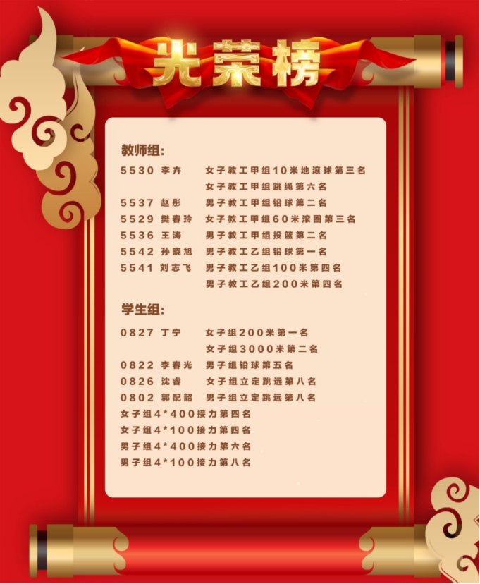 获得学生组团体总分第六名、精神文明先进集体、体育联赛优秀组织单位三项集体荣誉,8项教职工项目和9项学生项目荣获奖项,学生丁宁打破女子组3000米赛事记录。