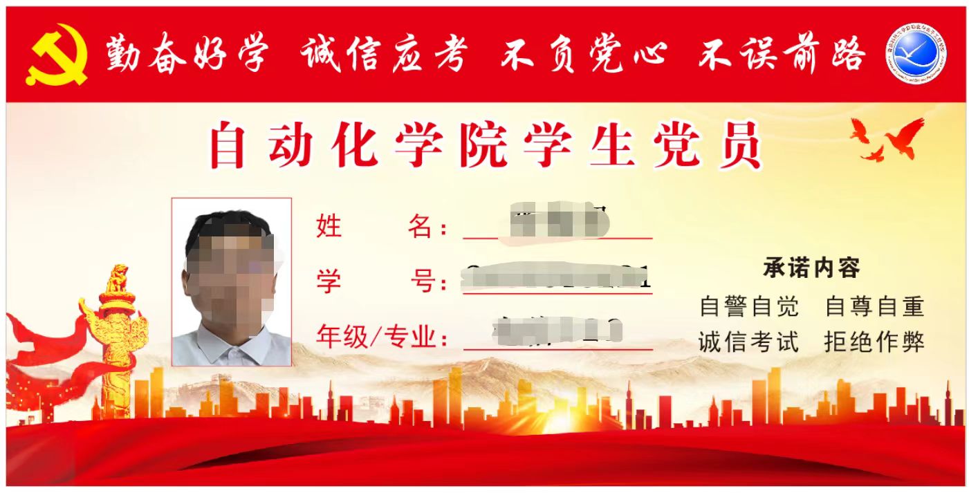 院徽、“勤奋好学,诚信应考,不负党心,不误前路”、“自警自觉,自尊自重,诚信考试,拒绝作弊”和姓名专业等各项信息。意在提醒学生党员身份,在每一次考试时以身作则,从自身做起,彰显党员风采,杜绝考试作弊。