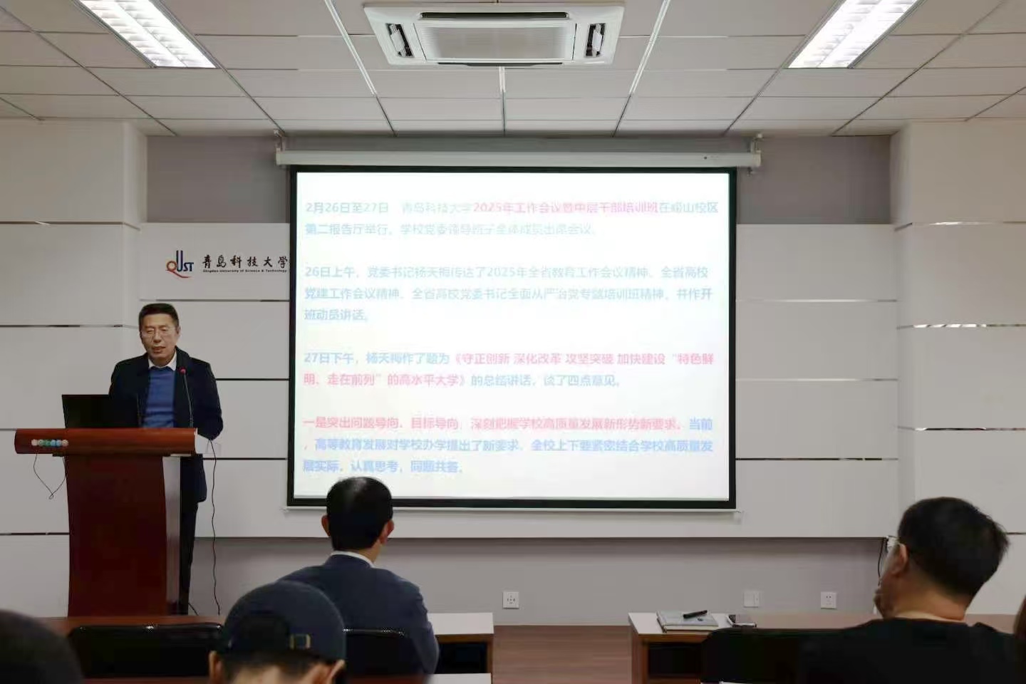 党委书记杨天梅、校长陈克正在中层干部会上的讲话精神。杨天梅书记以《守正创新深化改革攻坚突破加快建设“特色鲜明、走在前列”的高水平大学》为题,提出四点要求:一是坚持问题导向与目标导向,科学研判高质量发展新形势;二是深化制度改革,以观念更新引领改革突破;三是聚力“811”项目建设、国家级奖励申报、“十五五”规划编制等攻坚任务;四是强化学术与管理两支队伍建设,提升队伍攻坚克难能力。陈克正校长系统总结2024年工作,部署2025年党建、学科建设、人才引育等八项重点任务,强调要锚定“十四五”收官目标,以改革创新加快实现“五年塑成优势”战略部署,奋力建设高水平大学。