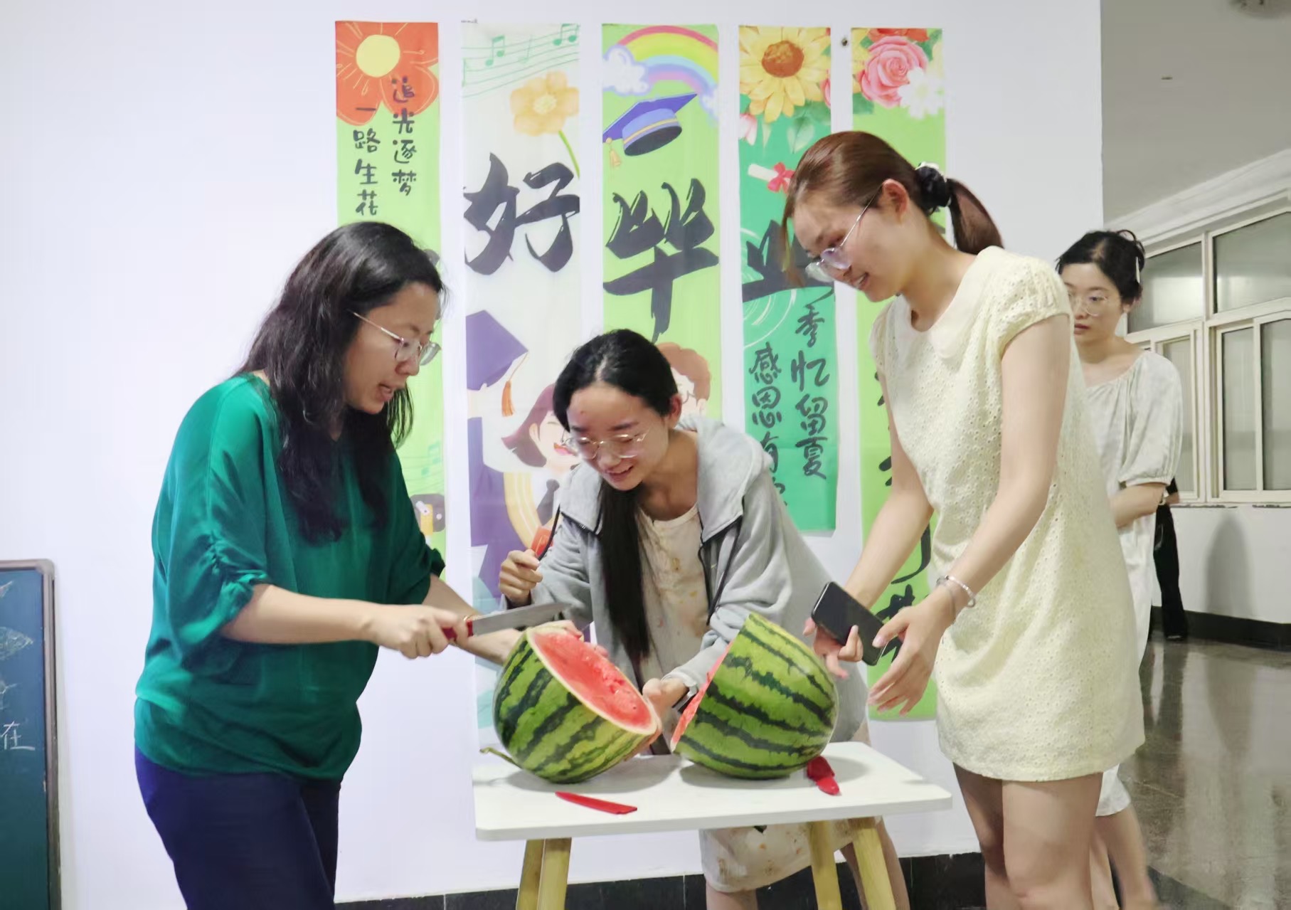精心筹备“瓜香送远行”特色环节。李卉、刘名森共同向毕业生代表馈赠解暑西瓜,寓意学子们未来生活“瓜熟蒂落、硕果累累”,事业发展“红红火火、甜美如饴”。现场师生共切“毕业瓜”,在欢声笑语中共话校园往事,畅叙理想抱负,定格珍贵记忆。