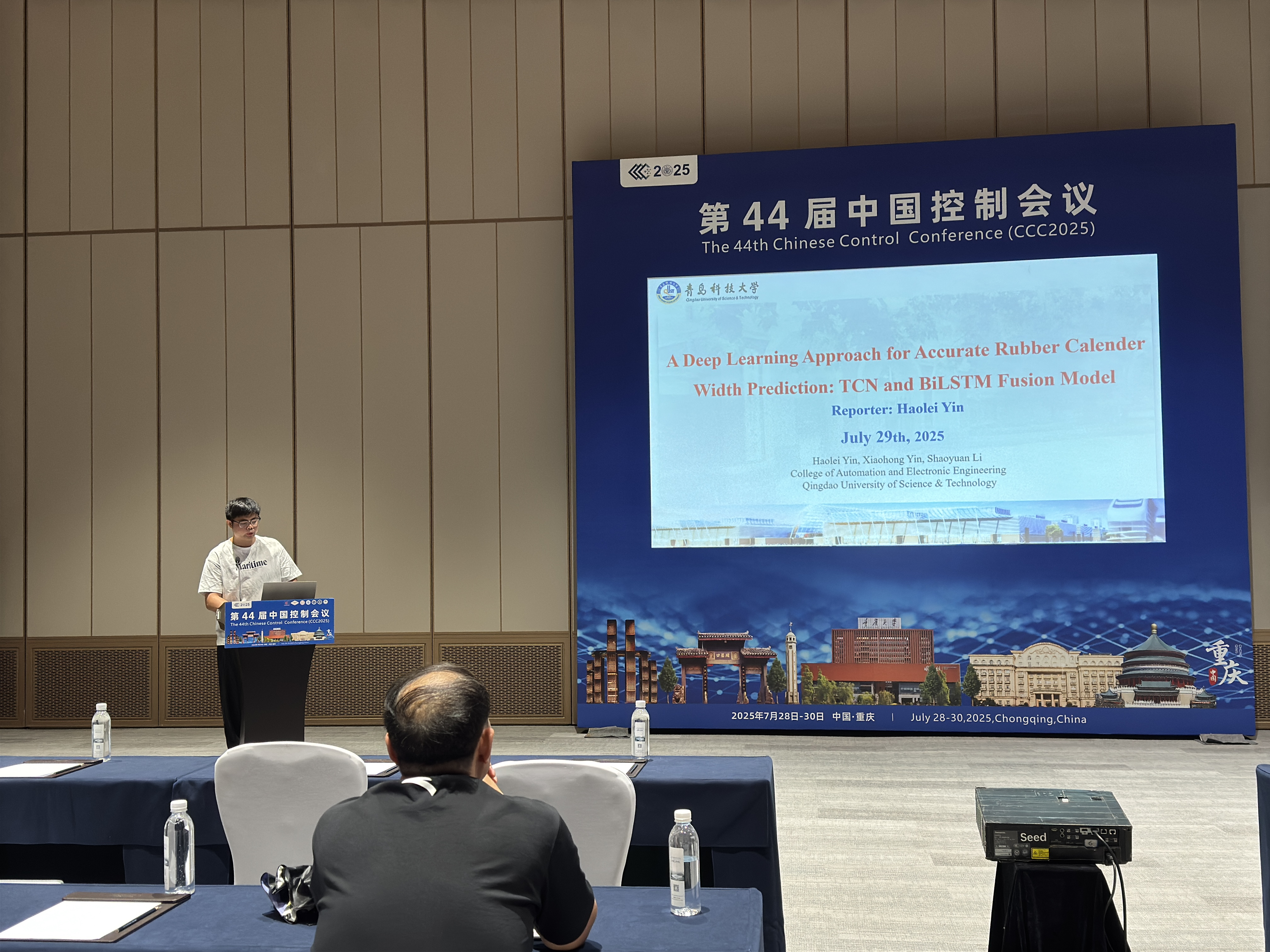的研究生们分别汇报了各自的学术研究成果。研究生尹浩磊作了题为“A Deep Learning Approach for Accurate Rubber Calender Width Prediction: TCN and BiLSTM Fusion Model”的报告。尹浩磊围绕橡胶压延工艺在轮胎生产中的重要性,提出了一种TCN-BiLSTM神经网络架构下橡胶压延系统胶条宽度模型。利用时间卷积网络通过捕捉时间序列中的局部依赖关系来提取时间特征,从而有效应对短期波动和干扰。将提取的时间特征输入双向长短期记忆网络,进一步建模长期依赖关系和复杂动态特性。利用过去和未来时间步的信息来建立耦合关系,实现跨不同时间尺度的全面时间特征提取,增强模型的预测和解释能力。