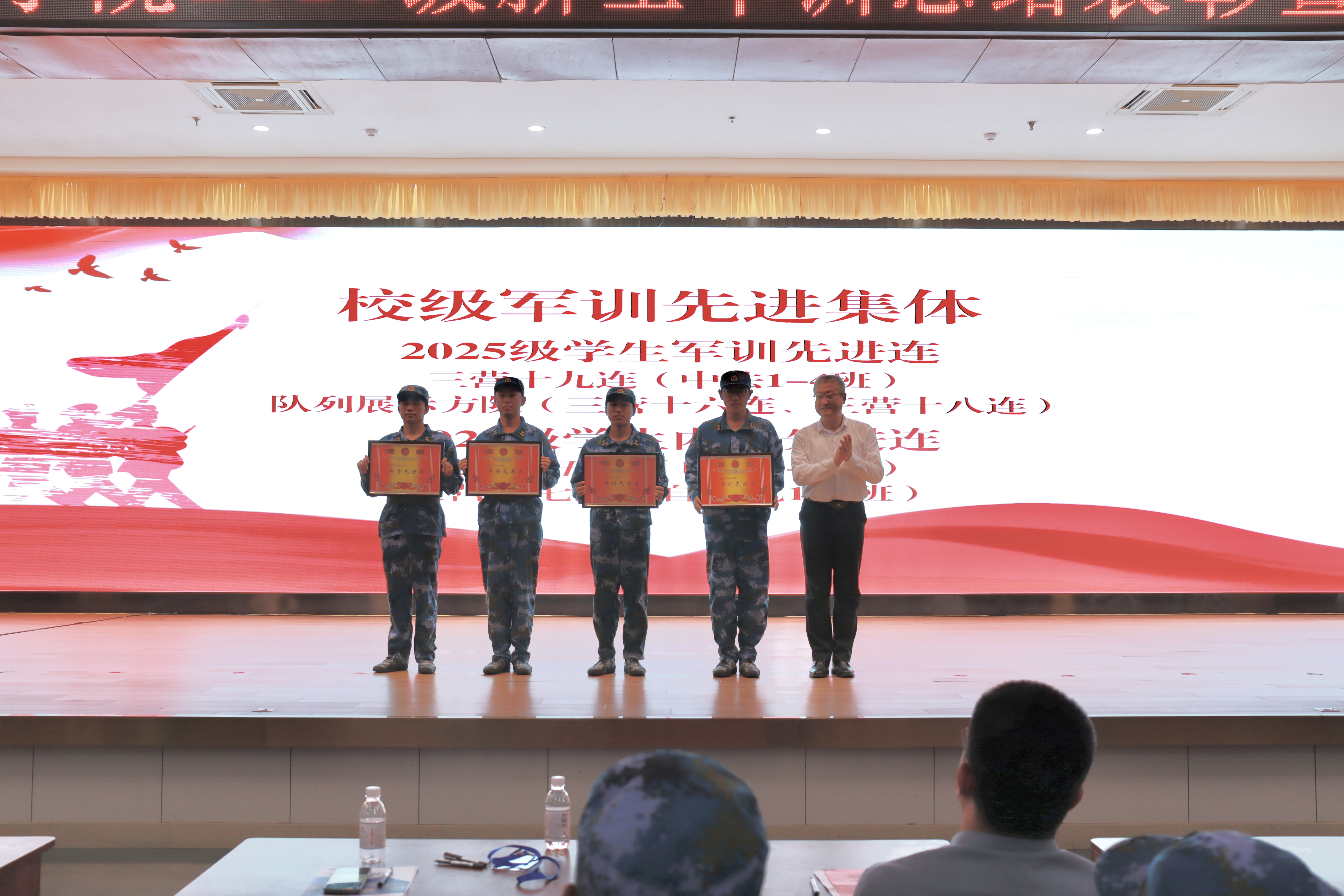 此次军训总结表彰大会暨国防教育主题活动的成功举办,不仅是对2025 级新生军训成果的全面总结,更是一次深刻的爱国主义教育和思想动员。相信 2025 级新生将以此次大会为新的起点,带着军训中的收获与感悟,在未来的大学生活中勇毅前行,成长为有理想、有本领、有担当的新时代青年。
