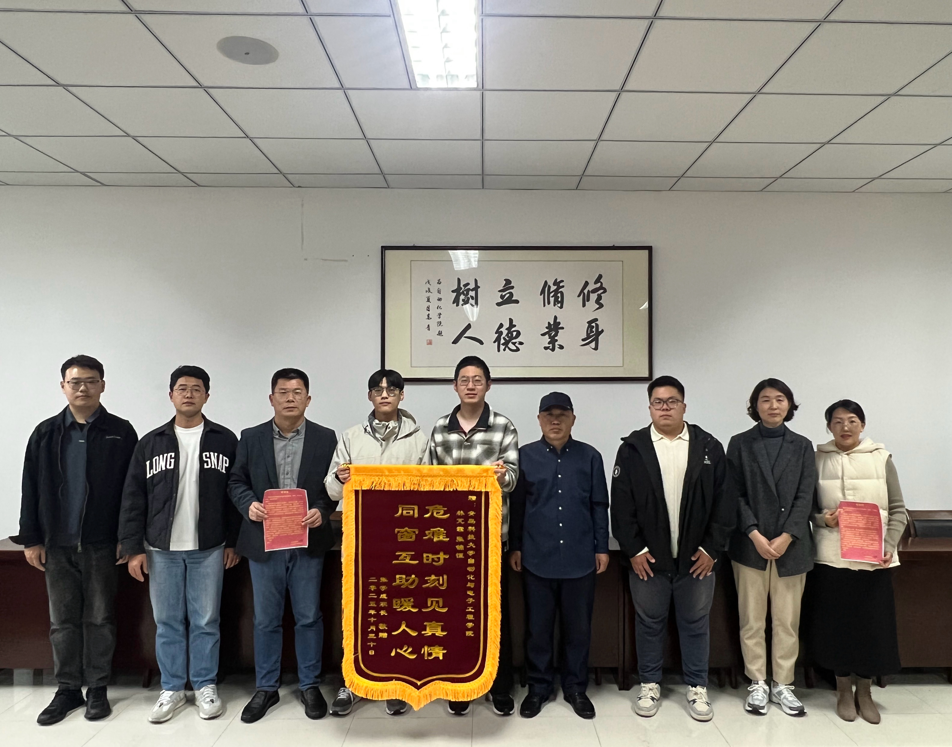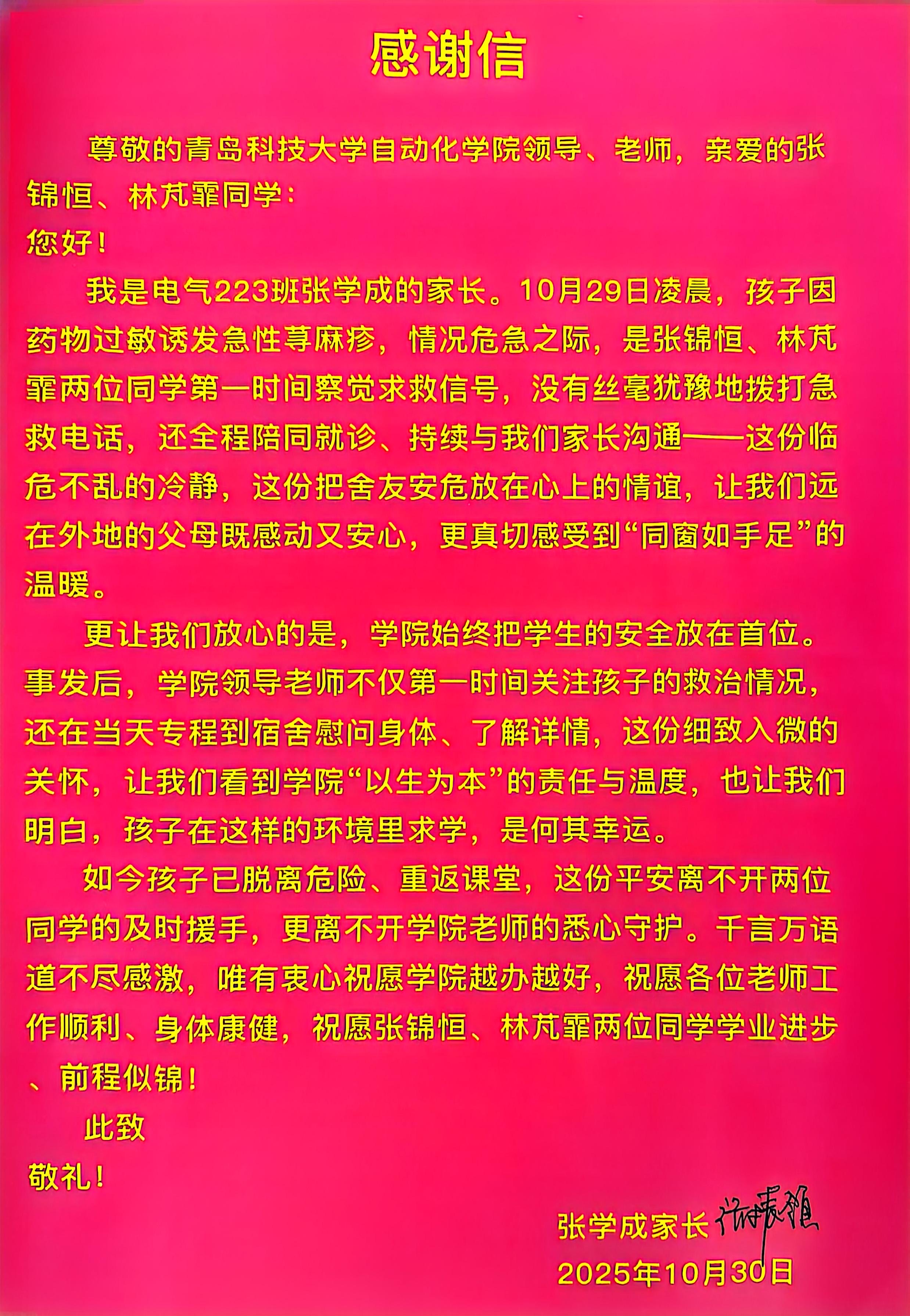 收到了一份来自广东湛江的特殊“礼物”——电气223班学生张学成的家长专程跨省而来,将一面印着“危难时刻见真情,同窗互助暖人心”的锦旗与感谢信,送到了电气223班学生张锦恒、林芃霏手中,以此感谢他们在深夜紧急救助突发急性荨麻疹的儿子,也向北京赛车PK10