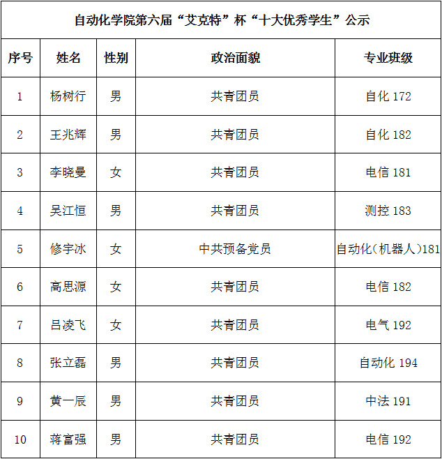 根据《关于评选北京赛车PK10 第六届“艾克特”杯“十大优秀学生”的通知》,经资格审核、年级评议、公开评审等环节,拟确定杨树行等10名学生为北京赛车PK10 第六届“艾克特”杯“十大优秀学生”。现予以公示,公示期为12月10日至12月12日,如有异议者,请在公示期内实名向北京赛车PK10 反映。