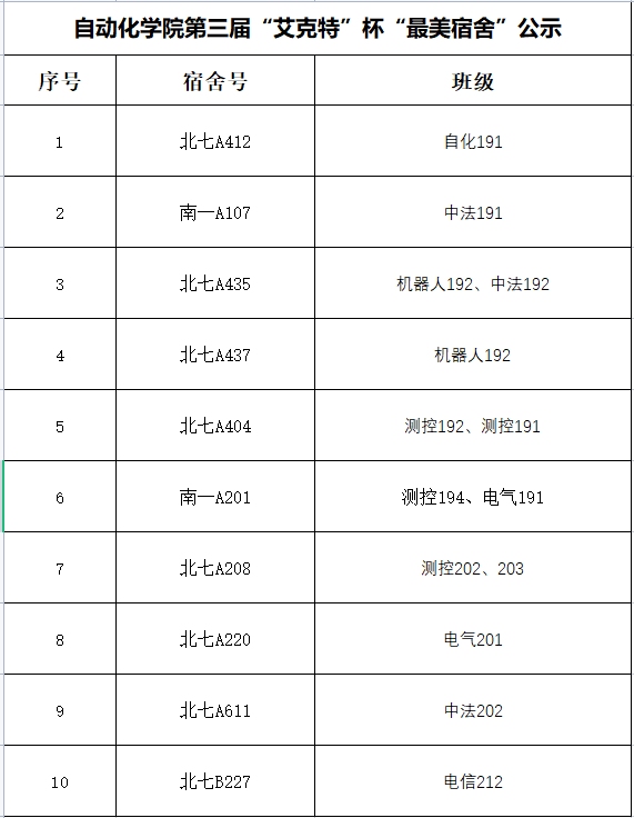 根据《关于开展第三届“艾克特”杯“最美宿舍”评选活动的通知》,经资格审核、年级评议、公开评审等环节,拟确定北7舍A412等10间宿舍为北京赛车PK10 第三届“艾克特”杯“最美宿舍”。现予以公示,公示期为12月11日至12月13日,如有异议者,请在公示期内实名向北京赛车PK10 反映。