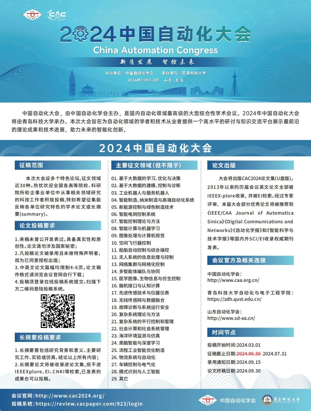 2024中国自动化大会将为全球自动化、信息与智能科学领域的专家学者和产业界的同仁提供展示创新成果、展望未来发展的高端学术平台,加强不同学科领域的交叉融合,引领自动化、信息与智能科学与技术的发展。