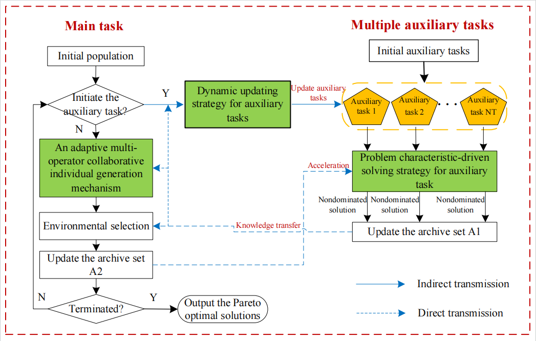 论文针对矿山综合能源系统运行优化问题,提出了多任务多目标运行优化框架,旨在有效地融合进化算法和数学规划的优势。该框架中,主任务使用全局搜索能力强的进化算法,解决多目标运行优化问题;辅助任务采用鲁棒约束处理能力强的数学规划,解决带权重参数的单目标运行优化问题。此外,利用进化过程知识,自主地调整辅助任务的规模和形式,并通过知识迁移机制,有效地引导种群的搜索区域。