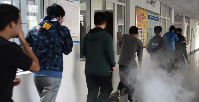 赵老师在宣讲的过程中结合实际,每个能力对应一个事例,并对事例的前因后果进行解剖,指出问题所在,点明杜绝、解决的方法。在赵老师宣讲完之后,全体学生回到各自宿舍,准备下一个环节:应急疏散演练。