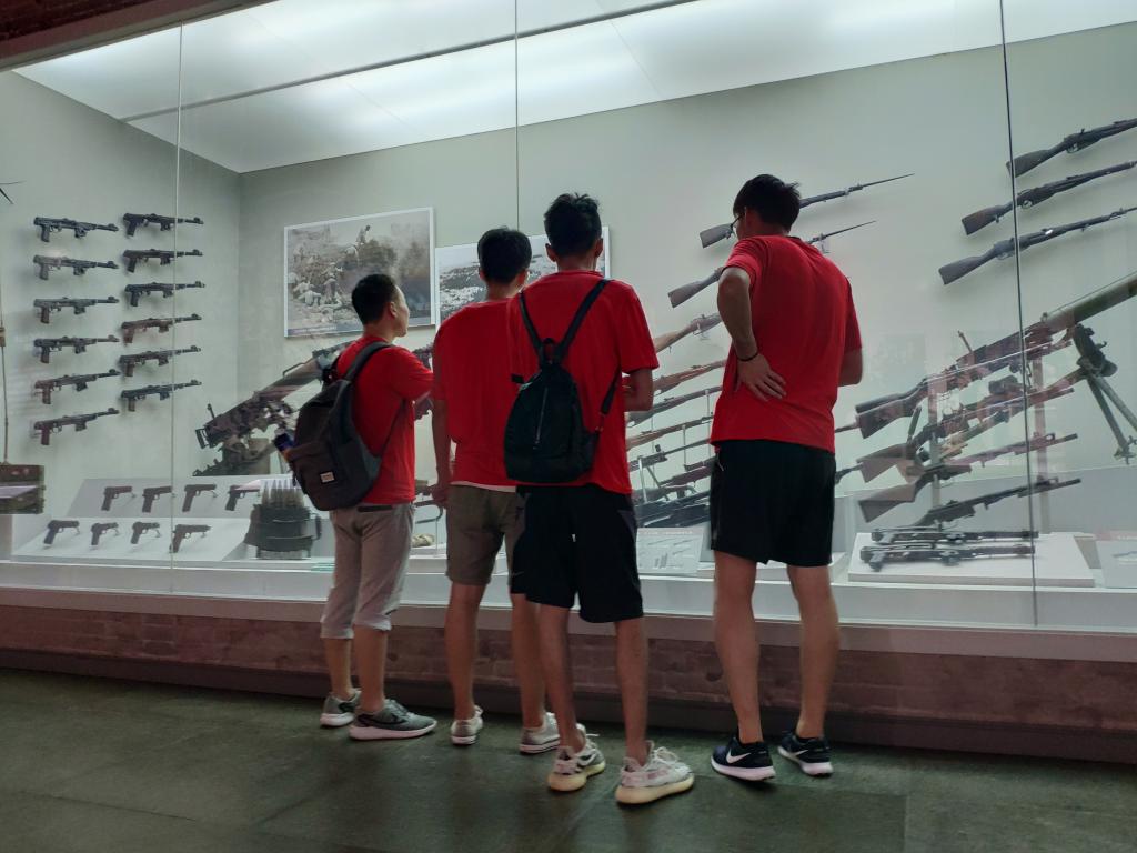走上二楼沂蒙精神展区,一串串文字和一幅幅图片映入眼帘,该展区详细地向队员们介绍了沂蒙革命根据地从建立到壮大的过程。展厅内存有大量的历史文物和资料文献,有军队行军用的水壶和挎包,有通讯员工作用的手稿文件,也有沂蒙战士获得的各类奖状和勋章。队员付宏祥、邹寓、贾登辉、郑远鹏怀着敬畏的心情仔细阅读着墙上文字,感叹中国共产党艰辛而又光辉的发展历程,称赞革命先烈们不畏生死的爱国情怀。