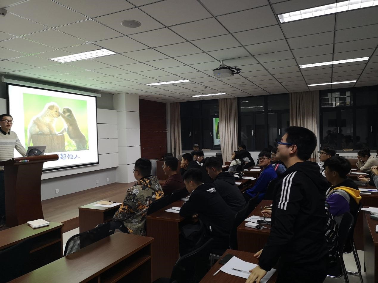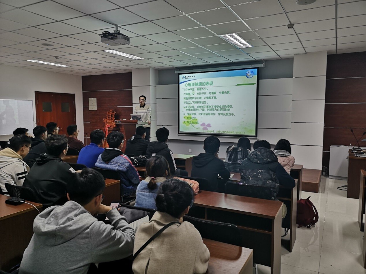 讲座由电气171班的张忠进主讲,心理协会宣传部主持。张忠进从心理健康的概念入手,引申到盖伦气质说,为大家解剖大学生经常出现的心理状态,进而对心理健康水平进行划分。
