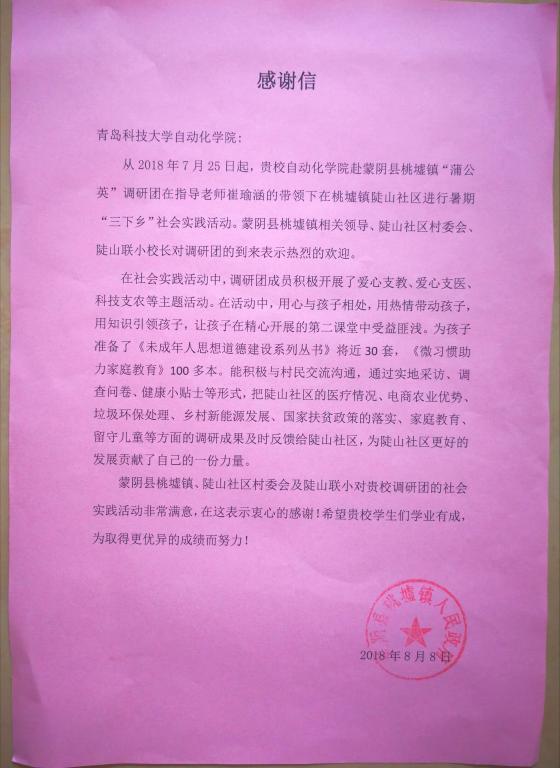 连续四年来此地开展暑期三下乡社会实践活动,希望以后也能继续传承下去,“情系蒙阴,助学支教”也将会是一个不变的主题。就如感谢信中所言,调研团期望给陡山社区带来希望,为陡山社区的建设及孩子们的教育贡献自己一份力量。