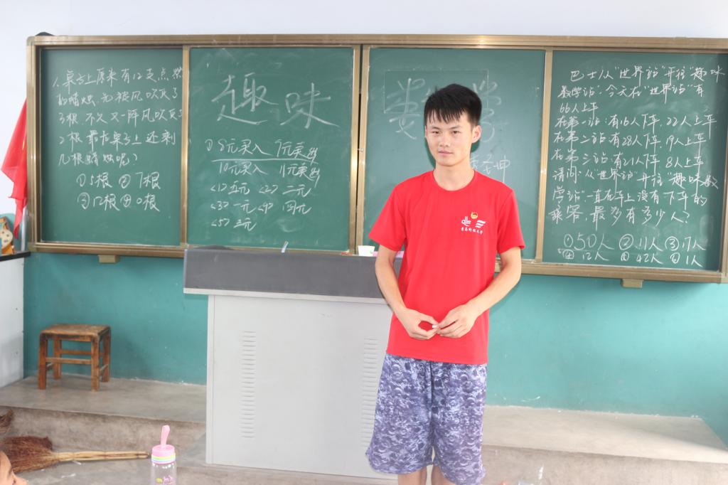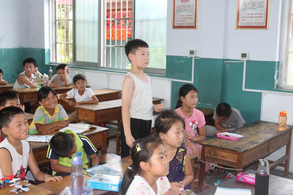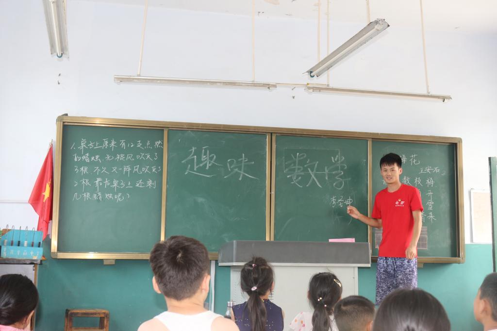 在课堂的开始,成员先给他们讲了一个笛卡尔和瑞典公主克里斯汀的爱情故事,聪明的笛卡尔在万般无奈之下想出了用一个数学公式向公主表达爱意,孩子们都吃惊的表示崇拜。一开始先给孩子们出了几道简单的智力测试题,鼓励孩子们起来回答问题,刚开始孩子们有点害羞,在调研团成员的鼓励下,有孩子勇敢的站起来,回答正确的发了糖果以示鼓励,相比之前受到鼓励的孩子更加踊跃了。在孩子们建立对数学浓厚的兴趣后,成员接下来讲了一个实用的快速计算乘法的方法。最后在一片欢笑声中结束了课堂。