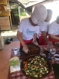 为了能够更好的奉献自己的一份力量,实践队员在巴厘岛吉安亚地区的特色农贸市场买了鸡肉蔬菜和水果,准备为当地老人做一份丰盛的午餐。在当地人的指引下,队员顺利完成了食品的加工,腌制,调配,烘烤做成了一道道当地特色的美食,并且队员专门服务的对象是经人介绍在农贸市场市场中售卖虾片的老妇人安杜纳,在交流的过程中,队员了解到安杜纳无儿无女,全凭政府每月的补助金以及售卖自己所做的虾片维持生活,虽然不算富裕,但也可以解决日常温饱和住宿。相比较中国老人单纯的凭借国家补助金生活而言,巴厘岛政府财政压力相对较小,且老年人生活水平较高。