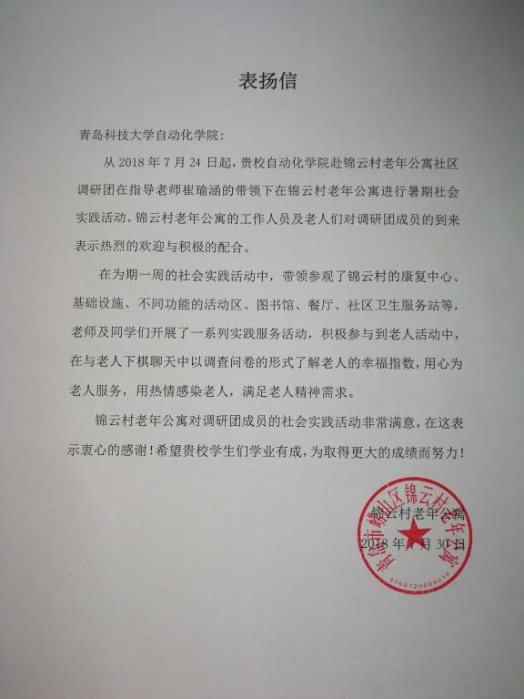 在调研的最后,老年公寓的工作人员也对调研团全体成员表示了感谢,感谢这么多天以来调研团成员对老人的关心和陪伴,也感谢调研团对老年公寓工作人员工作得支持。最后,工作人员将一封表扬信交给了调研团,以表示对调研团工作的感激。同时这封表扬信也是对调研团工作能力的认可,让调研团全体成员内心无比激动。