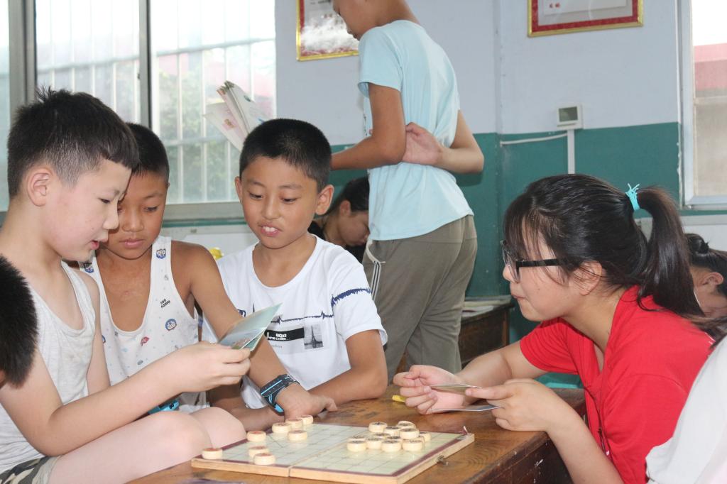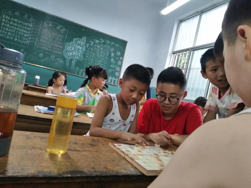 “两军对敌立双赢,坐运神机决死生”,教室里到处洋溢着欢声笑语,充满了棋子碰撞的声音。在上课的过程中,调研团发现不少孩子有象棋的基础,大部分同学也透露出对象棋浓厚的兴趣。为照顾那些零基础的孩子,调研团决定从最基本的规则讲起,“马走日,象走田,车走直路跑翻山,士走斜线护将边,小卒一去不回还”,简单的几句口诀,孩子们听的津津有味,成员讲的兴致勃勃。熟悉基本规则后,调研团组织孩子们进行了简单的比赛,可以看出孩子们的认真态度。