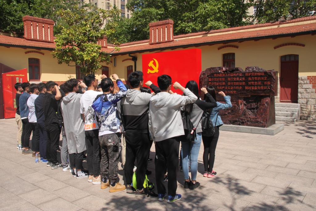 在讲解员的引领下,毕业生党员瞻仰了王尽美、刘少奇、邓恩铭、李蔚农塑像,聆听老一辈革命家创建青岛第一个中共党组织—中共青岛组、领导四方机厂、日商纱厂工人大罢工等风云故事,所有参观学习的党员同志无不肃然起敬、心生敬佩。纪念馆内勾勒的建党历程、职工宿舍伟人曾经的聚首、老写字台上秘密印写的布告 、“老支前”捐献的奖状...博物馆内的一件件藏品,向我们再现了那个波谲云诡的时代,我们的前辈为摆脱殖民统治、推动反帝爱国运动所做的努力和牺牲。重温那段浩浩荡荡的历史,在场人难掩内心激动,随后,全体党员重温入党誓词,进行了庄严的入党宣誓,表达对党的无限忠诚与热爱。