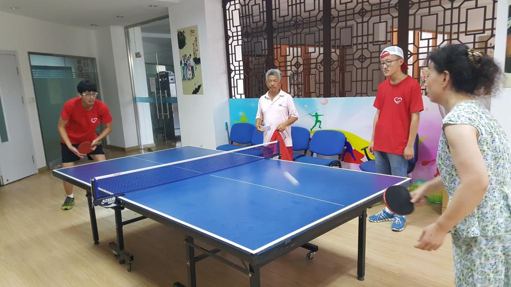 上午,调研团到达幸福中心,这里常有大学生来做各种志愿活动,老人们显然并不拘谨,很热情的招呼着志愿者们陪他们运动。气息均匀以后,大家看着老人们稳健的步伐,提出打球的建议,又考虑到室外炎热,最终决定打乒乓球。几番来回,可以看出老人们平时在这乒乓球上可没少下功夫,在反应速度、巧劲的运用上,比起年轻人丝毫不差。负责人杨晓玲表示,在这里类似的课程不少,每次一来志愿者老人们总是会跟青年们比一比,他们也不服老。随后是舞蹈课,志愿者们主动请缨一同前往学习。在练习室,一排排站的整整齐齐的老人们,跟随着老师认真的学习着每一个动作,虽然笨拙但老人们格外用心。舞蹈老师表示,很多老人都是没有一点的舞蹈功底,但是她们几乎每天都来练习,风雨无阻。