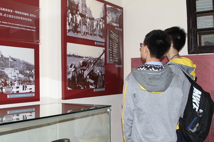 同学们走出校园,将科技与文化相结合,一场博物馆知识有奖问答游戏拉开了本次参观活动的序幕,引起了同学们的强烈兴趣。青岛市邮电博物馆是前德意志帝国邮局的旧址,其内展示了人类通讯上的逐步发展,老式的电话接转台、日本占领青岛发行的明信片、德国邮局的电话机房、爱立信壁挂式磁石电话机等一件件科技文化实物,时代特征强烈,吸引着同学们上前驻足观看,并拍照留念。在参观过程中,同学们严格遵守着馆内规章,安静观看,游走在中华文明历史长廊,不断学习;感受时代新事物,与时俱进。活动临近尾声,同学们纷纷在此合影留念。
