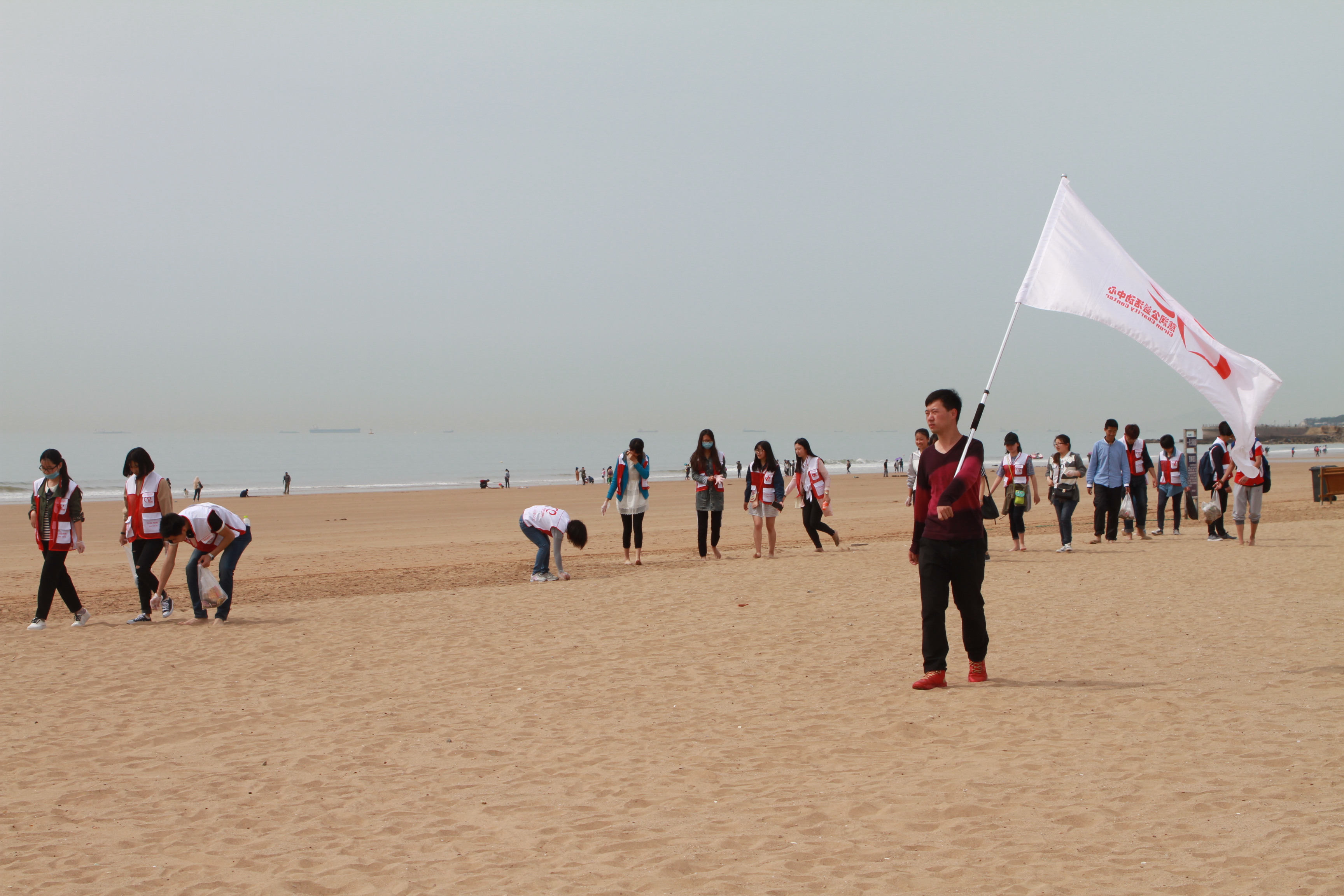 上午8点半所有人员集合完毕后,根据事先划分好的区域,在负责人的指挥下,将志愿者五人一组,分成两对。活动初始,志愿者们以中心雕像为基点,站成两排,分别沿着沙滩和绿化带向东和向西两个方向全方位覆盖进行洁滩。在活动中,志愿者们不怕脏,不怕累,仔细用手在沙滩上捡拾垃圾,用实际行动保护美丽的海滩。经过了数个小时在沙滩上的劳动,每一位志愿者都是大汗淋漓,十分疲惫。在海滩劳动固然是辛苦的,但通过这次沙滩清理活动,志愿者们不仅体会到了环保工人的劳累,同时也树立了保护海滩卫生、文明出游等意识,成功履行了作为一名“文明使者”的责任。