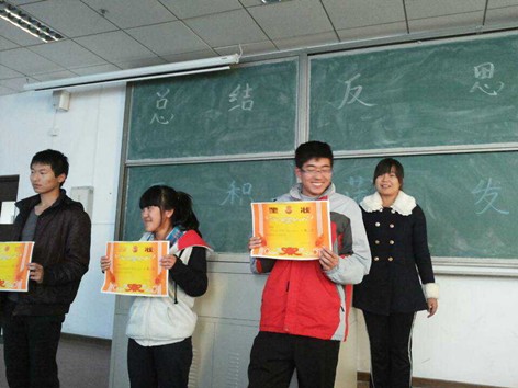 下午四点,班会准时开始。首先由班长薛祎对班级从开学到现在所取得的成绩进行了总结,鼓励了辩论赛、足球队、演讲比赛、象棋比赛、户外文化节、宿舍文化节等活动的参赛人员。然后由副班长总结期中考试的情况,并号召大家为即将到来的期末考试做好充分的准备。接下来团支书为在期中考试中取得优异成绩的同学颁发奖状,台下响起了热烈的掌声。班会有条不紊的进行着,学习委员就大家最关心的学分和挂科问题进行了补充说明,提醒大家不要把及格作为目标,使大家认识到大学学习也绝不能懈怠。为宣传北京赛车PK10
