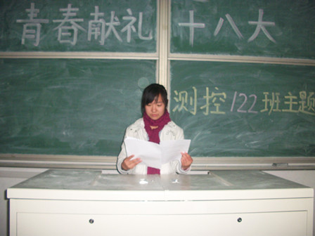 ,在十八大胜利召开之日,测控122班举行了以“高举团旗跟党走,青春献礼十八大”为主题的班会。