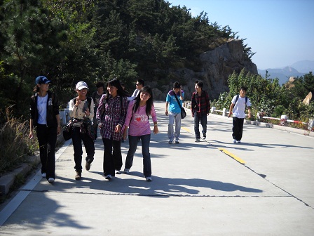 早晨八点半出发,经过两个小时的路程,来到巨峰脚下,开始登顶之行。途中我们选择了更有挑战性的小路,在途中也遇到了不少的艰难险阻,但是参加活动的同学之间相互帮助、团结协作,顺利地通过了每一个障碍,在快要登顶的时候,有些女同学坚持不住了,同学们始终坚持团队理念相互鼓励,共同进退。最终全体同学在下午两点成功登顶。登顶之后,大家都异常兴奋,把先前登山的劳累全都抛在了脑后。在漫长下山途中,我们对在这次活动中的感悟做了交流。
