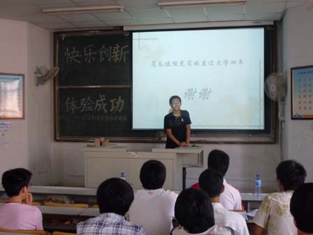 到场的嘉宾有已考入浙江大学研究生的张国锋,他曾参加过08、09年两届电子设计大赛并分别取得山东省二等奖和全国二等奖的好成绩。以及参加过“挑战杯”创业设计大赛并入围省级比赛的自动化095班的宋君明同学。首先,张国锋同学针对自己参加电子设计大赛的亲身体验对如何参加电子设计大赛、如何解决参赛时遇到的问题等问题一一作了详细解答,在场的同学们都认真的做了详细的笔记。在张同学讲话最后,他给在场的同学提出了几点可行的意见,让同学们在科技创新的过程中少走弯路。接下来是由宋君明同学对自己参加创业大赛的认识与感悟做了演讲,他就自己的参赛作品“太阳能热水器”做了讲解,他主要讲了参赛时发生的给自己留下深刻印象的事情,还有对自己的启发。