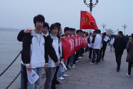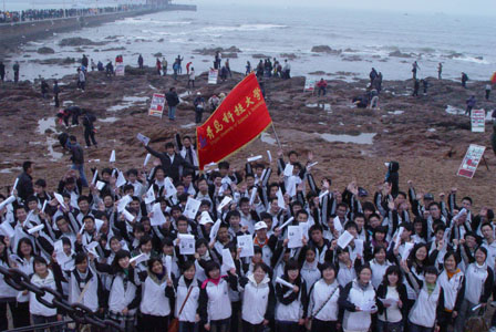 的传单,同时邀请游人在横幅上签下自己的名字。许多游人在横幅上写下自已的名字表达自己对环保事业的支持,横幅上留下了不同年龄,不同肤色,不同语言的人的名字。在海边,同学们踏实工作,用纸做的或者布做的袋子,捡起游人随意丢弃的垃圾,同学们在弯腰俯首之间,展现出热爱环保事业的青科大学子的风采。中午十二点,大家离开栈桥,说笑着徒步向鲁迅公园进发。到达鲁迅公园后,大家分开,五人或者十人一组开始吃午饭。午饭时,大家仍是趣味不断,大家或是聚在一起欣赏文艺部的同学奉上的动听的歌曲,或是来到海边感受海的狂澜。之后,大家离开鲁迅公园,又徒步行走到中山公园。一路上,歌声笑声相随,大家虽然累,但很快乐。最后,大家在中山公园门口合影留念,集体活动结束,同学自行游览中山公园。三月的公园生机盎然,大家三五成群,欣赏了公园里含苞待放的灿然樱花。