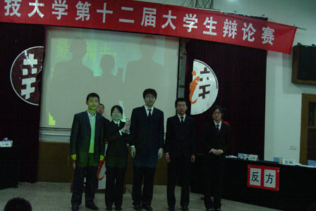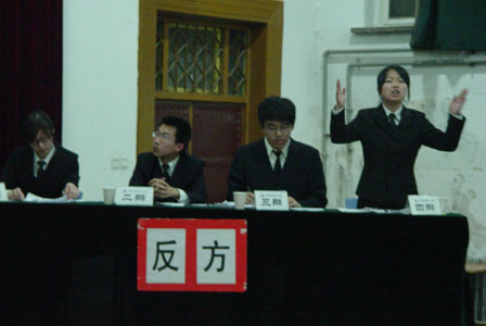 在这个忙碌的周三晚上,观众们却异常热情,早早的占满了偌大的讲学厅,每个人脸上都写满了热切的期待。晚上七点整,在主持人的宣布和介绍后,比赛准时举行。双方辩手的开场介绍就新颖活泼,用角色扮演的陈词方式,生动地引出了辩题——杜绝盗版,政府角色更重要。在场下观众的热烈掌声下,比赛进入正题。首先,正反方开始一辩的三分钟开篇陈词,各自详细地阐述了自己的观点和理由,分别从政府的特殊地位和暴力后盾以及消费者与盗版商的直接交易的参与关系为切入点进行切题阐述。在一辩全面系统的陈词后,双方二辩又迅速根据对方一辩的陈词迅速找出漏洞与突破口进行临场的三分钟补充陈词,思维敏锐度令观众叹为观止。在火药味渐渐弥散全场的陈词阶段后,比赛由攻辩环节推入下一个小高潮,三辩的尖锐问题一个个地抛向对手,当观众还在各自揣测问题的突破口,辩手们早已站起来口若悬河的回答对方的问题了,这是辩手的反应能力、见识和语言表达能力综合体现。接下来时三辩一对一的针锋相对。之后,在一个短暂的四辩小结后,观众们终于等到了全场的高潮——自由辩论阶段。“请问对方辩友,你们举出了政府去年打击了八百多家的盗版商,但面对目前庞大的盗版市场,这个数字又显得何其微小呢?”“那么你们强调消费者的作用,可是你们又什么时候见到媒体上报道消费者打击了八百多家盗版商呢?”…… 双方雄辩滔滔,气势逼人,活跃的气氛令观众不自禁的爆发掌声。在对抗的激烈余韵仍令观众回味时,比赛进入了最后的总结,四辩纵观全场,统摄观点进行阐述。最终,在全场雷鸣般的掌声中,辩论完美结束。
