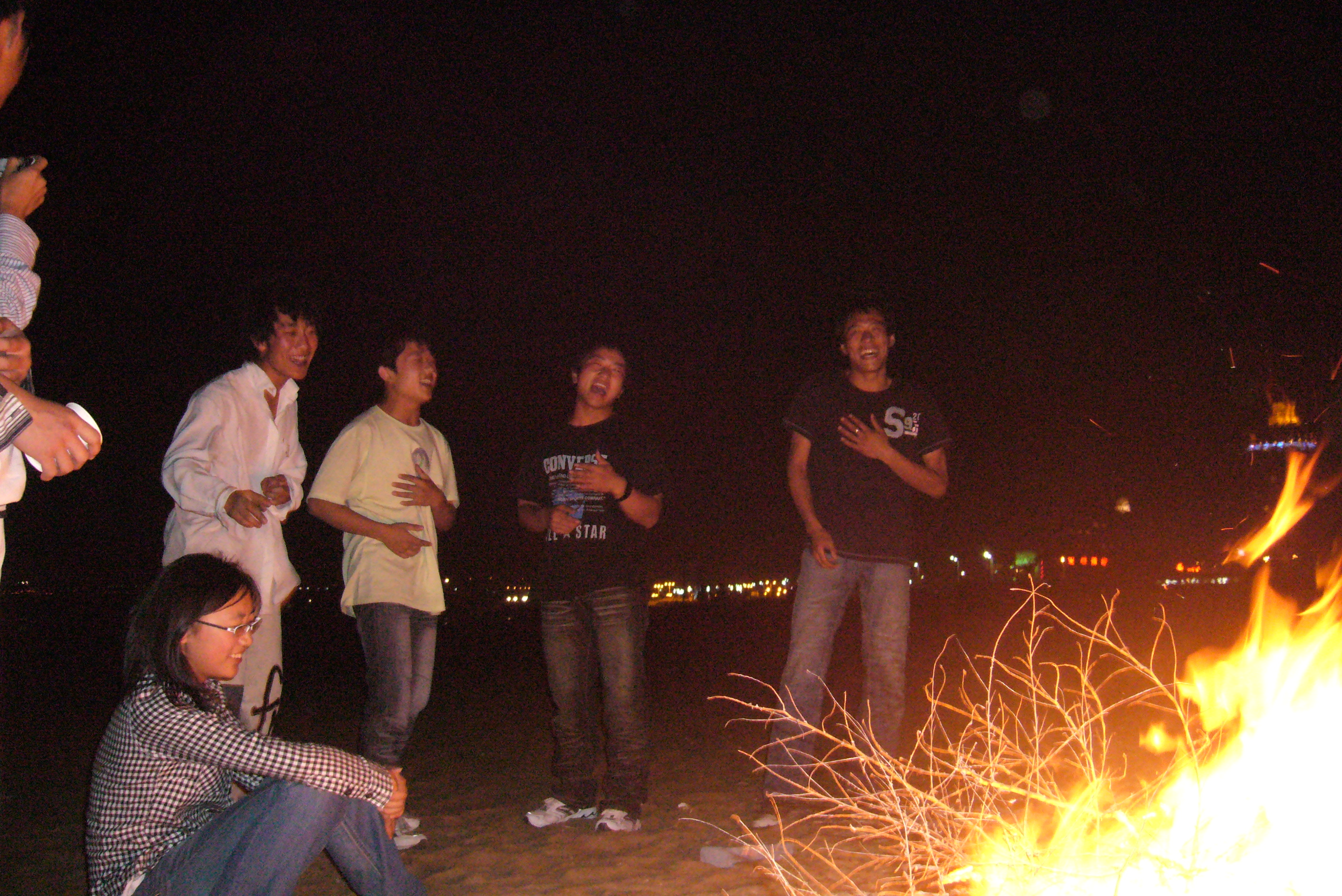 晚上,烧烤完毕后,同学们又组织了篝火晚会,以宿舍为单位表演节目。大家围着篝