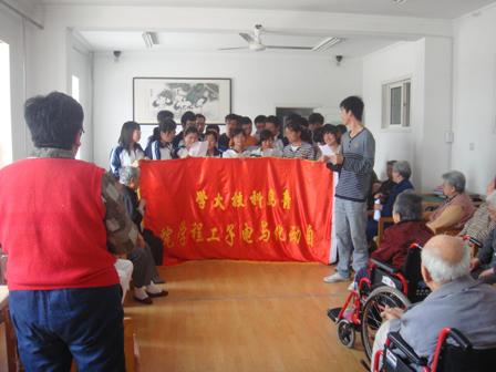在志愿者同学的带领下我们早早的来到了疗养院,老人们个个精神矍铄,热情欢迎同学们的到来。为了让老人们高兴,同学们精心为老人们准备了一系列精彩的节目,包括健康经典的老歌、舞蹈和一些适合她们的游戏。同学们与老人们亲切的交谈,有的给老人按摩。活动进行中,老人们热情高涨,虽然她们行动不便,但从她们洋溢着笑容的脸上可以读出她们内心的喜悦。一些老人也即兴演唱了他们的拿手歌曲,仿佛又回到了年轻时代。活动了进行了大约两个半钟头,老人们到活动结束时仍舍不得离开,同学们把老人搀回住处,有的老人拿出水果给同学们吃,有的还欢迎同学们再来。前哨疗养院负责人周主任说:“在这么一个特别的日子举办一个这样的活动非常有意义,老人们平时没有娱乐性、参与性这么强的活动,她们之间很少能聚到一块,每天也仅仅是散散步打打牌,通过这次活动可以看出她们的心情非常舒畅,连平时不爱说话的几位老人也经不住大家的感染一展歌喉”。