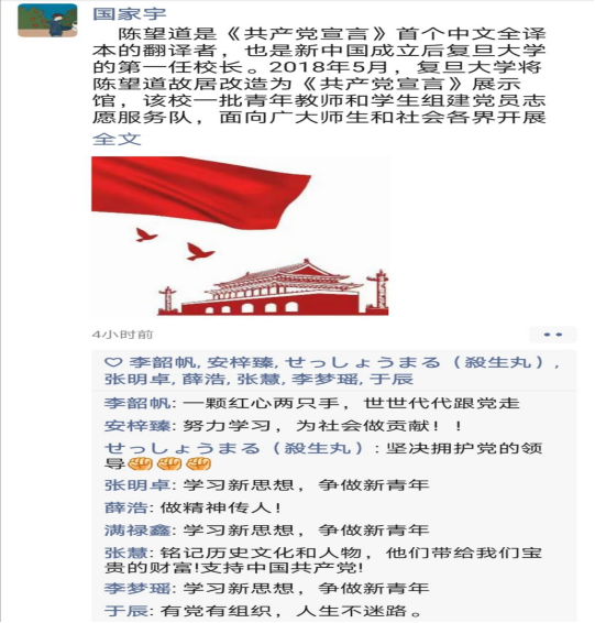 团支部全体成员一起观看了《共产党宣言》解读等视频,在学思践悟中坚定理想信念,在奋发有为中践行初心使命。同学们以宿舍为小组集中学习了新中国史、改革开放史、社会主义发展史等内容,并通过朋友圈等线上平台发表了自己的学习心得。