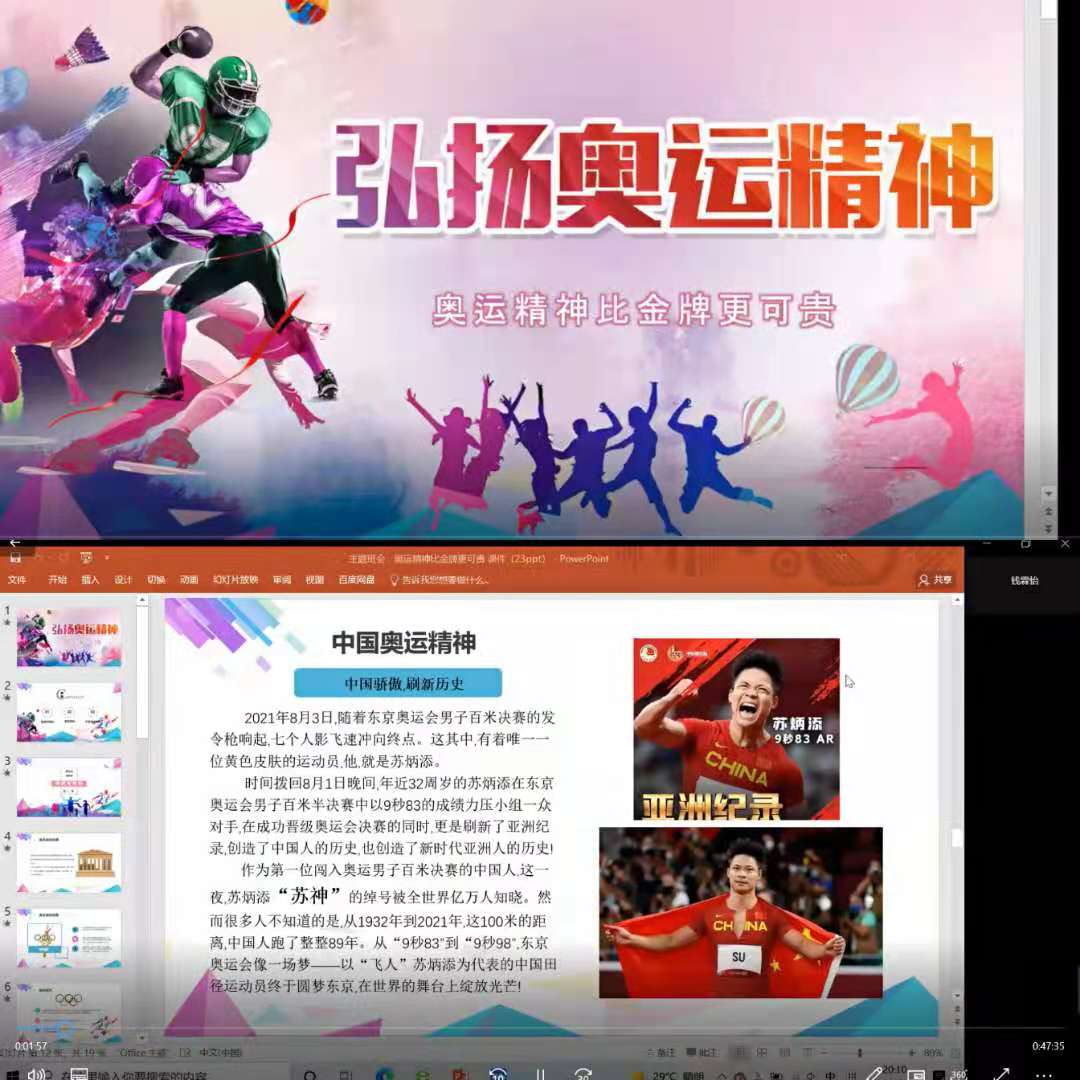宣讲团成员钱霖怡从奥运会概述、奥运会精神、中国奥运精神进行宣讲。介绍之前通过一个短视频带领团支部成员回顾了奥运会中国健儿们的精彩瞬间,就犹如背景音乐《朱雀》所说:他们亦如磐石坚守,就算面临一场暴风,也会让一切回归,变得更完美。雷电碰撞,夺目的锋芒,令团支部成员们热血沸腾,纷纷在弹幕刷屏。
