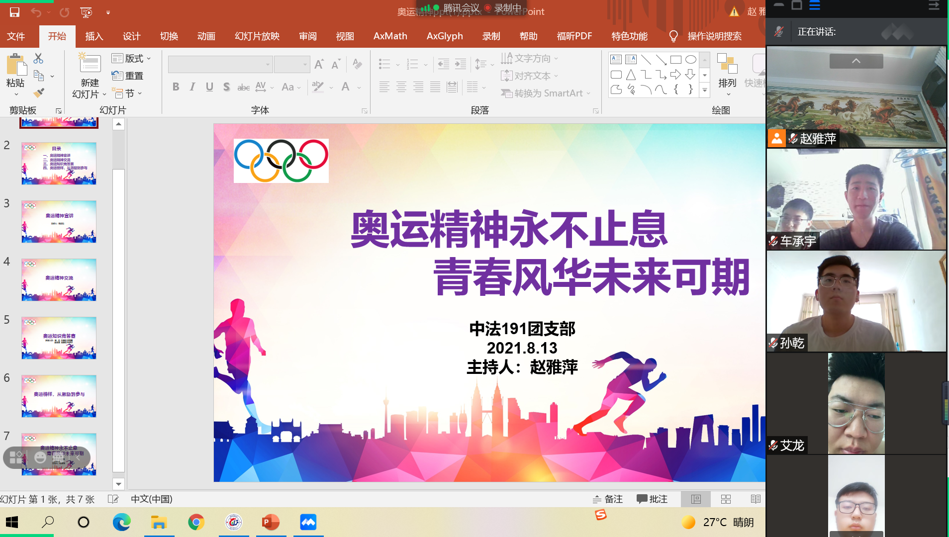 为响应“党旗所指就是团旗所向”的号召,充分展现团组织作为党的助手和后备军的担当,同时传承和发扬奥林匹克精神和中华体育精神,中法191团支部于8月13日开展“奥运精神永不止息,青春风华未来可期”主题团日活动。