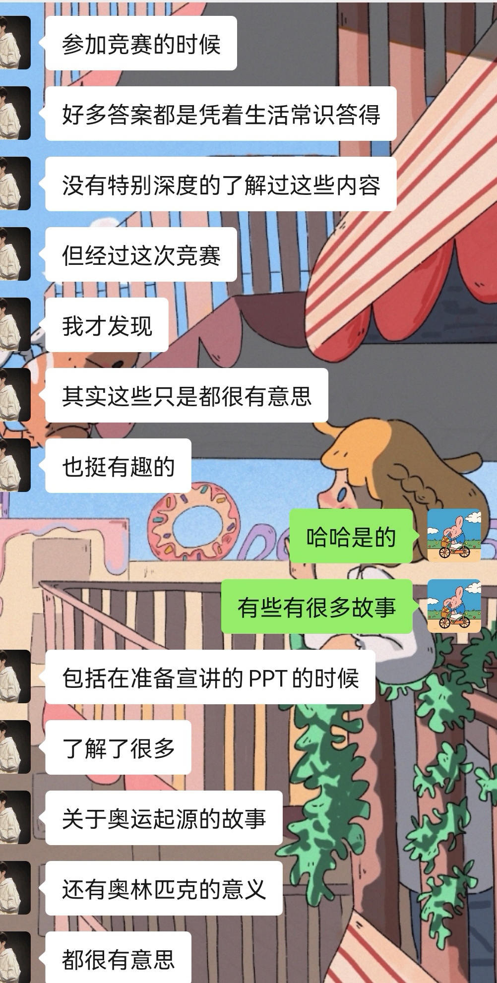 支部成员车承宇回顾当时在北苑餐厅吃饭,观看男子百米半决赛,苏神苏炳添9秒83打破亚洲记录,整个餐厅的人员都在沸腾。团支部副书记季灏与大家分享了乒乓球精神,讲述了我国乒乓球一直保持优异成绩的背后,离不开运动健儿们的勤学苦练和不屈不挠,并倡导团支部成员学习并传承乒乓球精神。