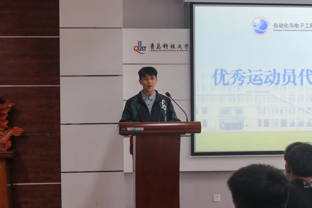 往届优秀运动员代表刘德师上台发言。他表示,运动员作为运动会的中坚力量,必将坚定必胜信念,赛前积极备战训练,不断挑战自我,力争刷新更高、更好的成绩,在即将到来的2022年校运会上赛出自化学子的昂扬斗志。