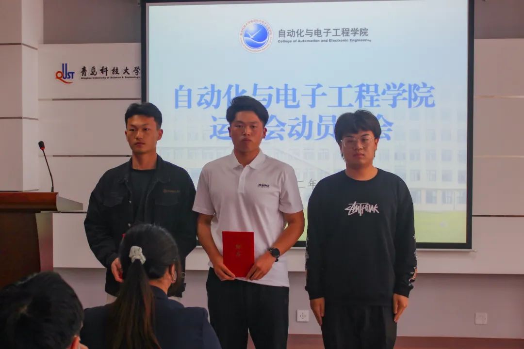 齐宇、王鹏两位同学作为运动员教练,院学生会主席团成员郝子淳为他们颁发聘书。