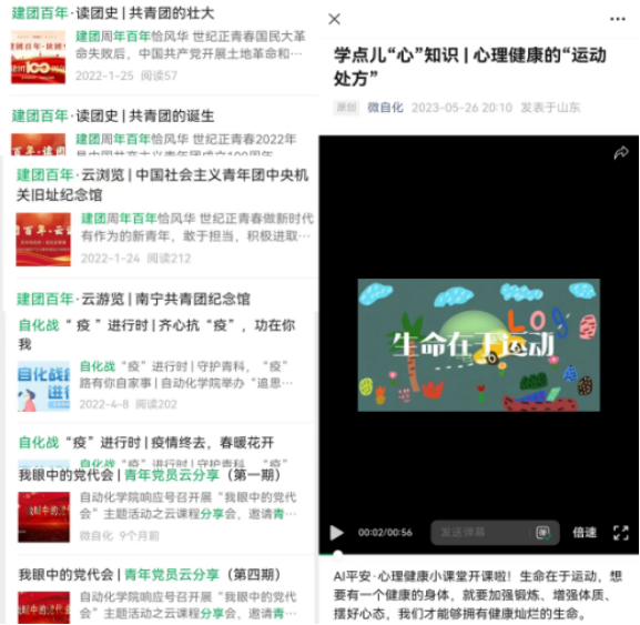 新媒体平台用户基础深厚,作品内容丰富,全年不断线。“微自化”累计总用户数5000+,累计发布推文1200余篇,年均阅读量突破20万。以2022年为例,推文阅读总量29.2万次,点赞在看破1.2万次,WCI指数位居全校前列。北京赛车PK10