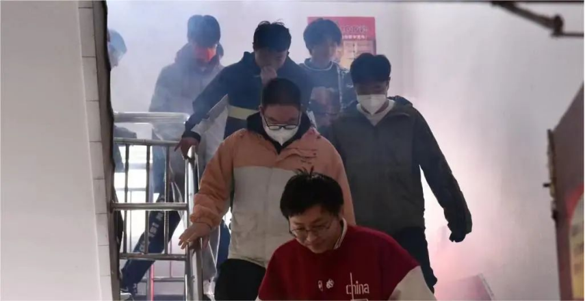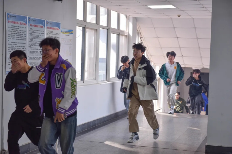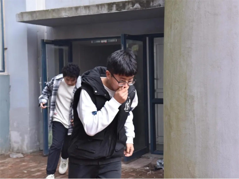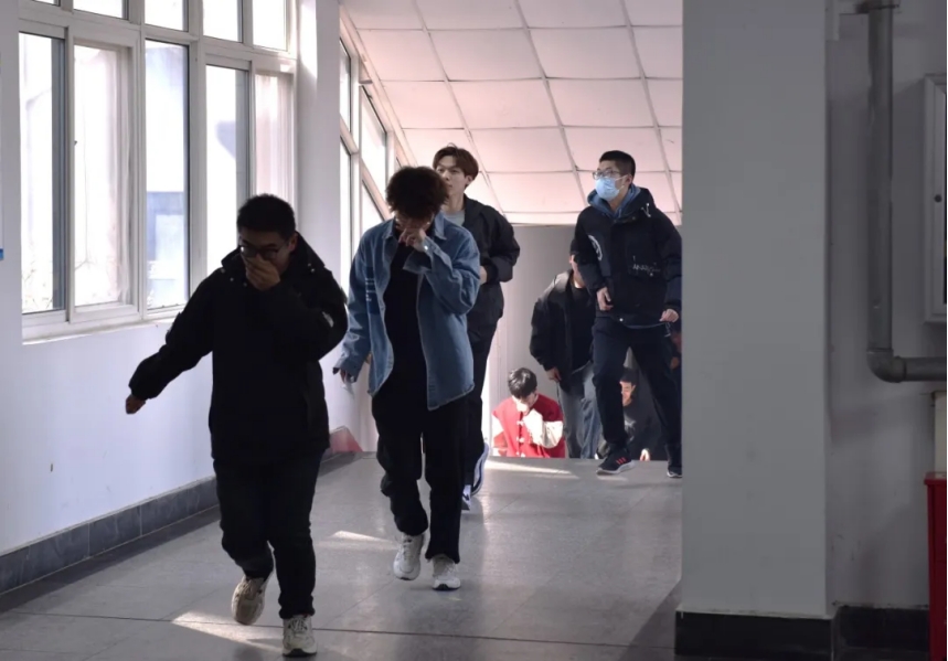 保卫处消防科老师赵淑东、于全波作主讲及指导。随着安全疏散警报拉响,演练正式开始。全体学生迅速做出反应,在老师和志愿者的带领引导下按设定好的疏散路线,快速、安全、有序地撤离宿舍。演练全程紧张、有序、迅速完成,全体学生无一遗漏顺利在安全地点集合,达成演练预期效果。